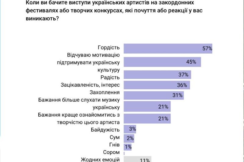 До 24 лютого 2022 року українськомовна музика становила 33% контенту. У 2025 році – вже 57%. 79% українців продовжують слухати музику англійською, 12% – російською, здебільшого старі треки українських артистів, і 16% – іншими мовами.