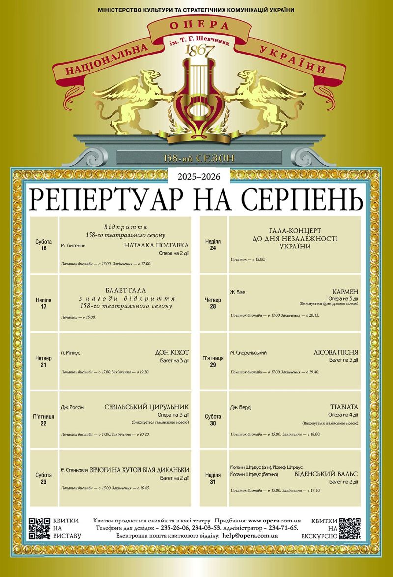 Серпнева афіша Національної опери України