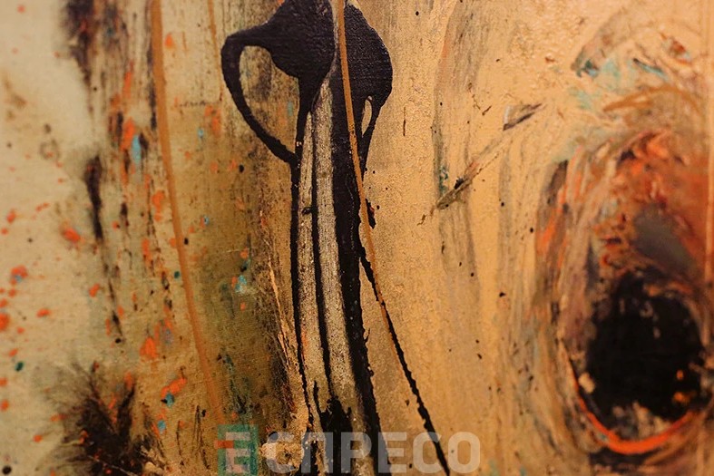 Дивився на готові якісь серії, які в мене є, і мені прийшло до голови показати саме цю. Її історія є трохи довшою, адже цій серії робіт вже близько 16 років – від того часу, коли я почав її створювати. І це вже третя локація, де виставлені ці роботи. Першою була Фабрика повидла, яка тоді ще не була Jam Factory, і це було в рамках Тижня актуального мистецтва. Другий пункт – це був київський Арсенал, Гоголь-фест. Це теж така споруда індустріальна, на місці, де раніше вироблялася зброя. Тобто, перша – де вироблялися консерви, повидло, друга – де вироблялася зброя, і третій пункт, що теж так трошки цікаво й символічно - Оперний театр. Ця серія домандрувала сюди і вона ніби цілий час змагається з інтер'єрами, в які потрапляє. І це цікаво з огляду самої такої суб'єктності серії для мене, як художника.