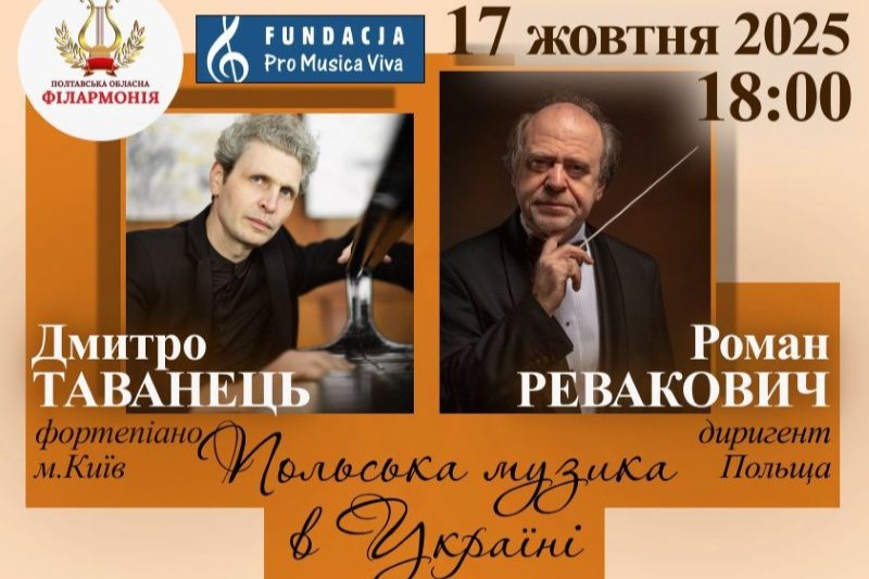 17 жовтня у Полтавської обласній філармонії відбудеться концерт "Польська музика в Україні". Камерний оркестр ім. Дмитра Ахшарумова під орудою диригента Романа Реваковича виконає твори твори польських комозиторів: Гражини Бацевіч, Мєчислава Карловіча, Вітольда Лютославського. Солістами будуть українські віртуози - піаніст Дмитро Таванець та скрипаль Андрій Павлов.