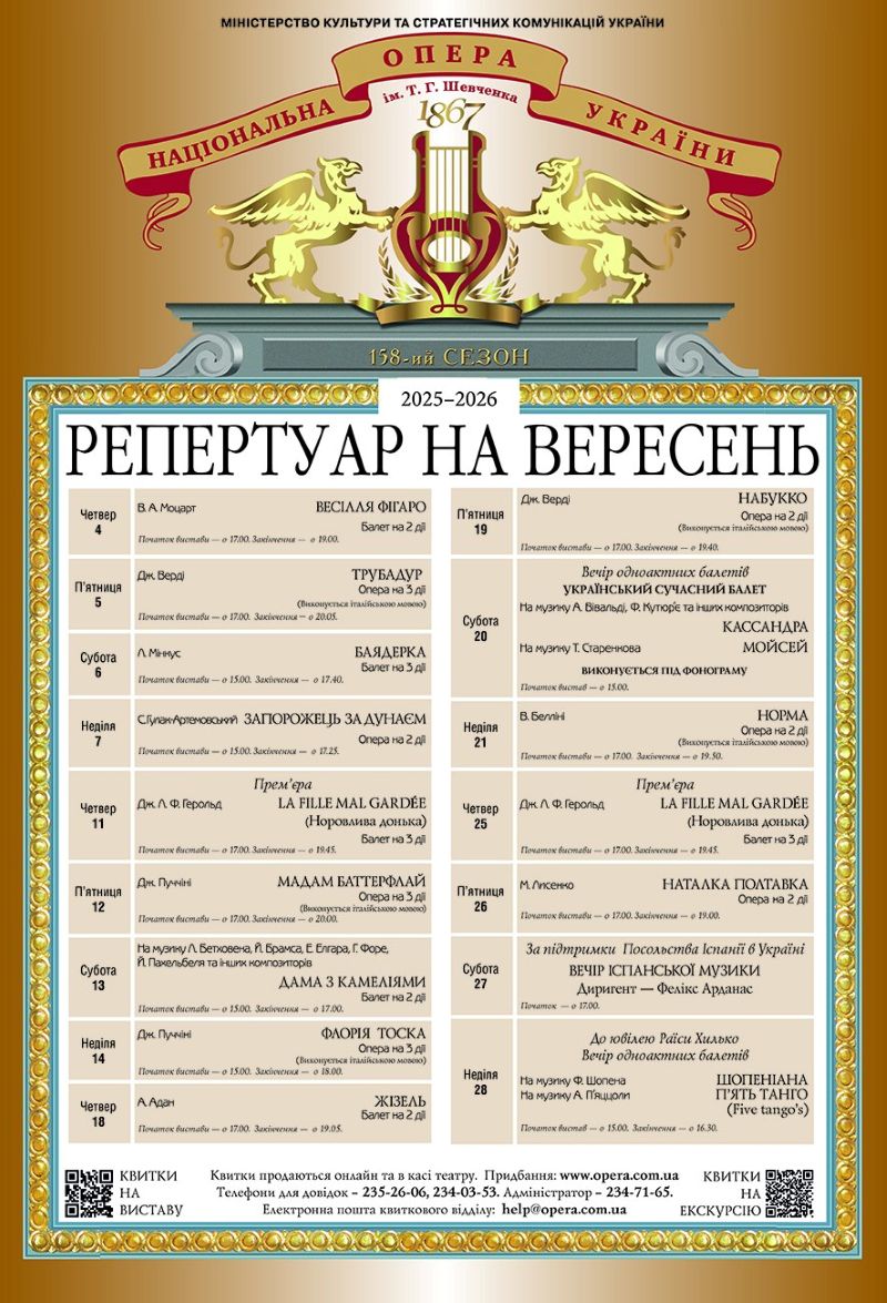 І хоча вистави все ще залишають виключно «денними» (інформація про початок вистави указана в афіші та на сайті театру), а кількість глядачів в залі все ще обмежена, Національна опера України своїм вересневим репертуаром гарантує піднесений настрій і глядачам, і виконавцям!